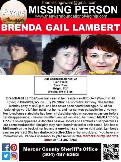 Brenda was last seen at approximately 9:00 p.m., July 26, 1992, at her home on Windmill Hill Road in Bluewell at her son's first birthday. Her car was left parked in the driveway. Everything she owned was still in her home. Her family suspects immediate and local foul play. Investigators believe her disappearance may be related to the disappearance of Mark Cook on January 14, 1993.