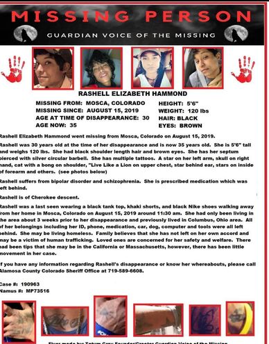 Rashell disappeared on August 15, 2019 from her mother's home in Colorado. She left on foot with no phone, identification, or medications. Her case is being investigated by Alamosa County Sheriffs Department and she is listed as a Missing Person in NAMUS.