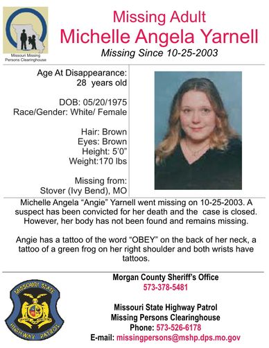 Michelle Angela “Angie” Yarnell went missing on October 25, 2003. A suspect has been convicted for her death and the case is closed. However, her body has not been found and remains missing. If you have information contact Morgan County Sheriff's Office 573-378-5481