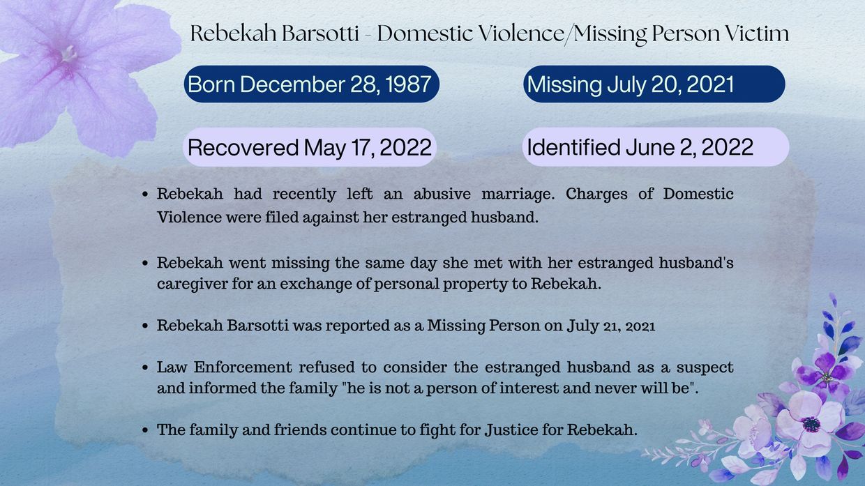 Rebekah's story highlights the urgent need for awareness and reform in addressing domestic violence and missing persons cases. Her family's pursuit of justice has shed light on systemic issues within the legal system, including the handling of domestic violence cases and the treatment of missing persons. Rebekah represents countless victims of domestic violence who are dismissed, blamed, or left unprotected — even in death. Her voice was silenced, she was made invisible, but her story must continue to be told.